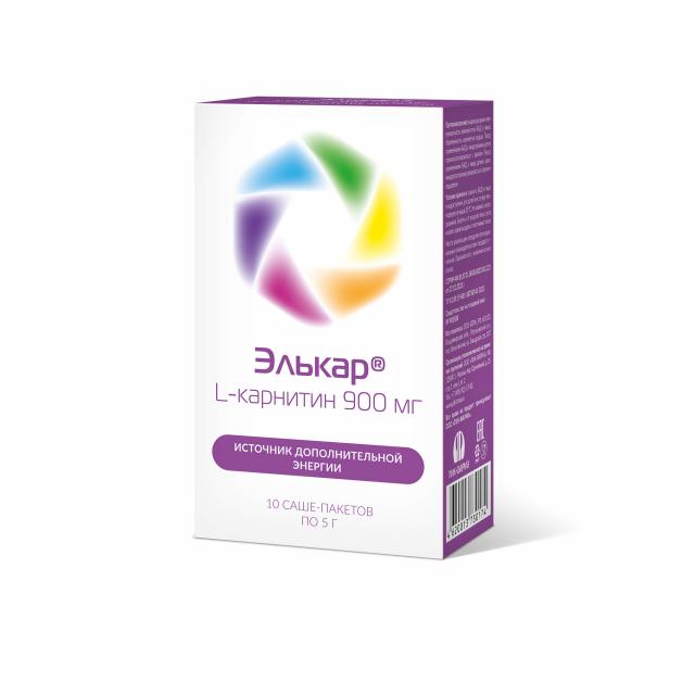 ЭЛЬКАР®, содержит 900 мг L-карнитина в 1 саше-пакете.