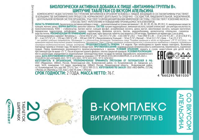 БИОЛОГИЧЕСКИ АКТИВНАЯ ДОБАВКА К ПИЩЕ «ВИТАМИНЫ ГРУППЫ B» ШИПУЧИЕ ТАБЛЕТКИ СО ВКУСОМ АПЕЛЬСИНА