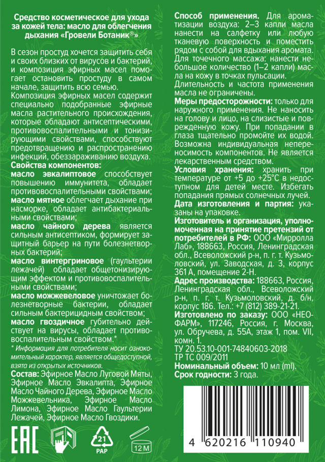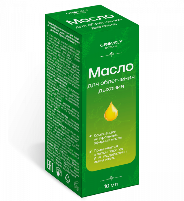Средство косметическое для ухода за кожей тела: масло для облегчения дыхания «Гровели Ботаник®»