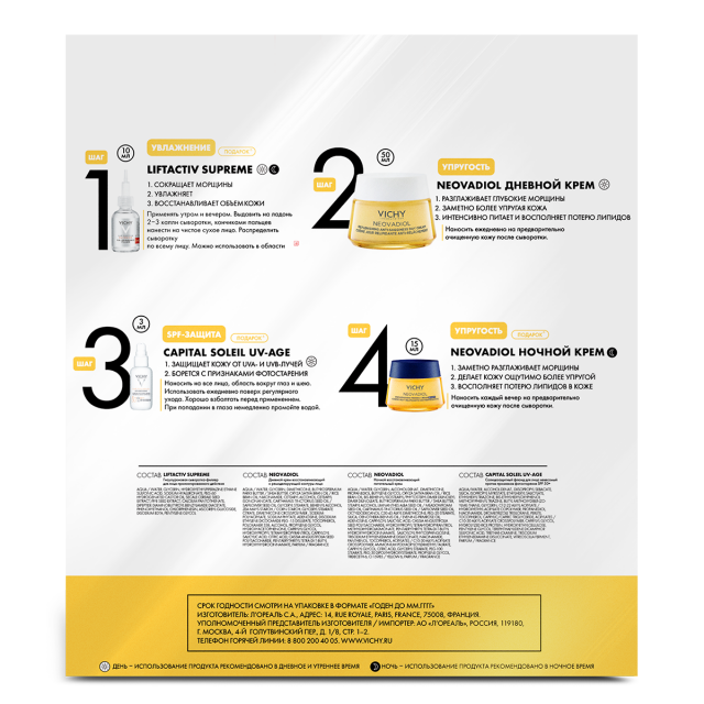 Виши Неовадиол набор крем дневной восстанавливающий и ремоделирующий 50мл+крем ночной 15мл+сыворотка Супрем HA 10мл+Капитал Солей UV Эйдж Дейли флюид SPF50+ 3мл