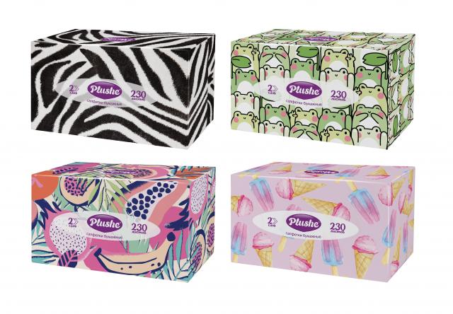 Салфетки бумажные в коробочках, Plushe 230листов, 2 сл, V-слож-е, Ассорти 20 в кор