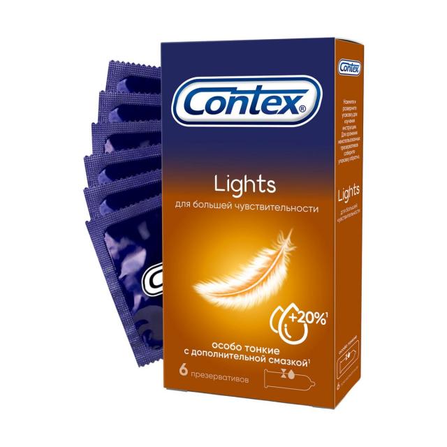 6 особо* тонких презервативов CONTEX ® LIGHTS (Лайтс) в силиконовой смазке для большей чувствительности. 78% потребителей согласны, что презервативы Contex Lights дают большую чувствительность по сравнению с презервативами Contex Classic.**