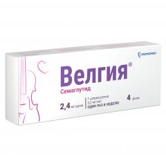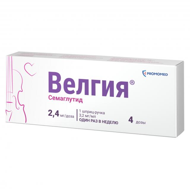 Велгия® выпускается в пяти разных шприц-ручках, каждая из которых содержит одну из следующих назначенных доз семаглутида: 0,25 мг/доза, 0,5 мг/доза, 1 мг/доза, 1,7 мг/доза, 2,4 мг/доза.