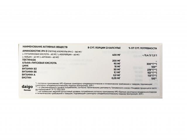 Состав: смесь D-Дермик (аминобиотик IPH D (пептид хлореллы IPH C, биоактивная среда из аминокислот: L-глутаминовая кислота, L-изолейцин, L-лейцин, L-аргинин), натуральный фермент пектиназа, альфа-липоевая кислота, цинка бисглицинат хелат, витамин B3 (никотинамид), витамин B5 (пантотенат кальция), витамин A (ацетат ретинола), витамин H (D-биотин)); капсула (пуллулан).
