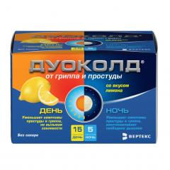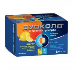 Дуоколд®– комбинированный препарат, представляет собой набор порошков «День» и «Ночь» с разным составом.Оказывает жаропонижающее, противовоспалительное, обезболивающее, противоаллергическое, ангиопротекторное (защищает стенки сосудов) и сосудосуживающее действия.