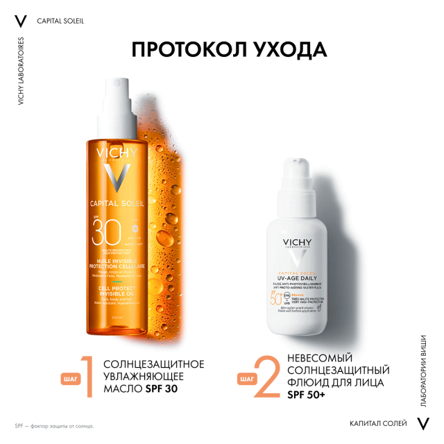 Невесомое масло VICHY CAPITAL SOLEIL CELL PROTECT SPF 30 – первое невидимое защитное средство, улучшающее качество кожи. Обладает высокой устойчивостью к воде. Новая масляная текстура Dry Touch подходит для лица, тела и кончиков волос