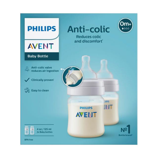 Бутылочки Philips Avent серии Anti-Colic разработаны для сокращения дискомфорта малыша при кормлении. Благодаря встроенному антиколиковому клапану воздух остается в бутылочке и не попадает в животик малыша. Бутылочка Philips Avent Anti-Colic: все лучшее для кормления вашего малыша от бренда №1 в мире . В комплекте 2 бутылочки 125 мл, 2 соски для новорожденных 0 мес + со встроенным антиколиковым клапаном.