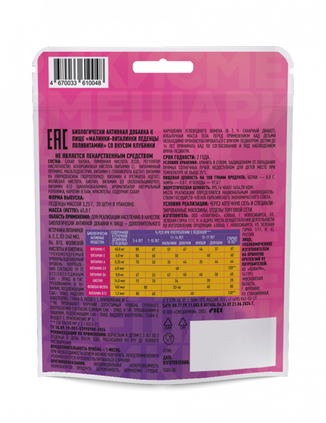 «МАЛИНКИ-ВИТАЛИНКИ леденцы Поливитамин» не являются лекарственным средством.