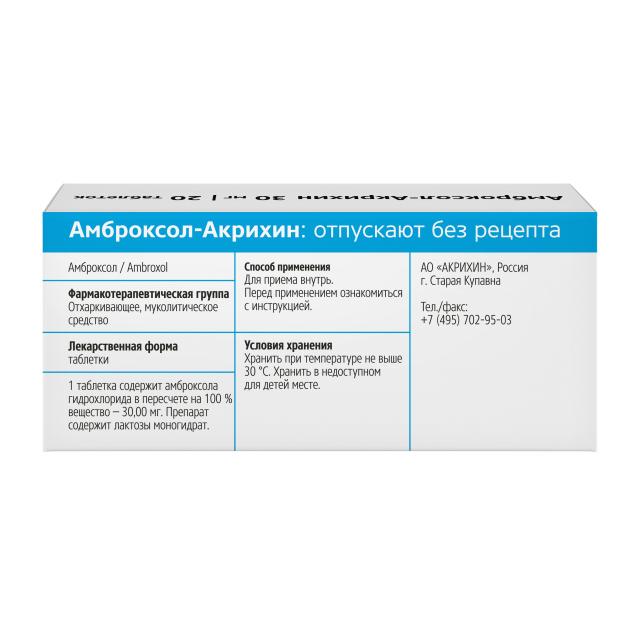 действующее вещество:амброксола гидрохлорид в пересчете на 100 % вещество - 30,00 мг; вспомогательные вещества:целлюлоза микрокристаллическая, лактозы моно-гидрат, кремния диоксид коллоидный, кроскармеллоза натрия, магния стеарат.
