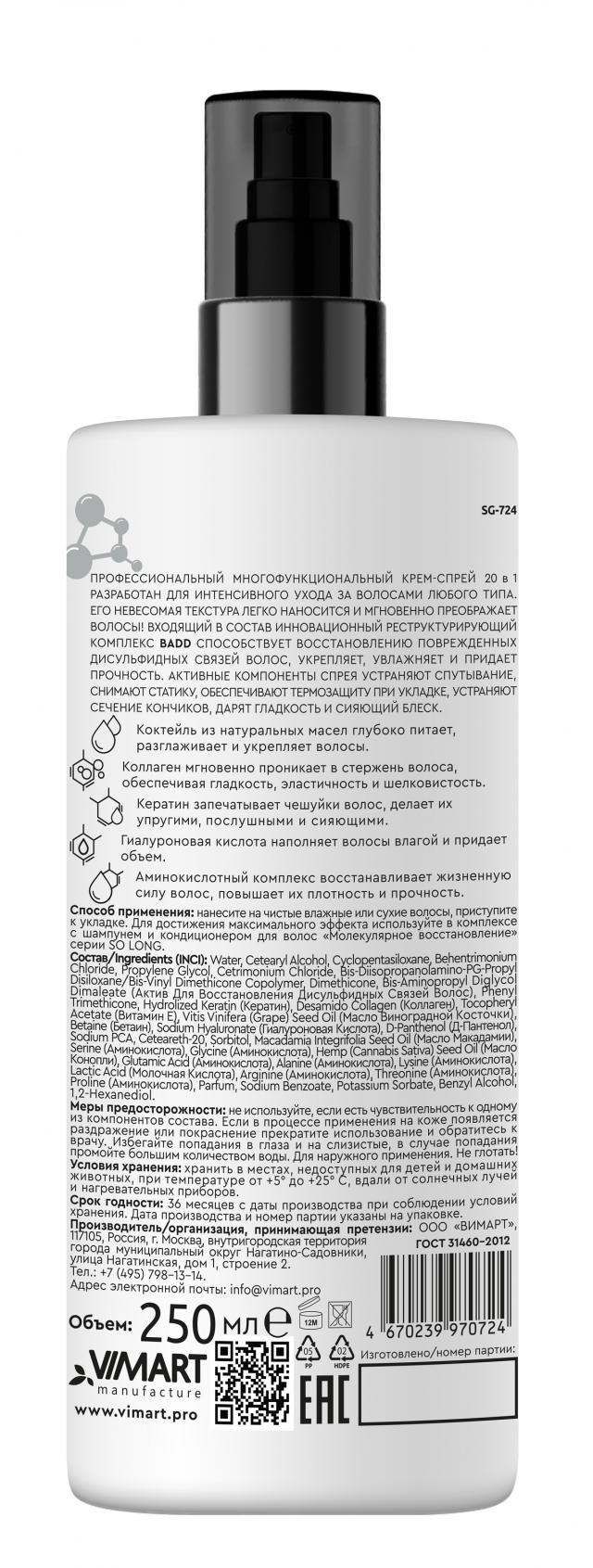 SO LONG SO LONG PROFESSIONAL Крем-спрей 20 в 1 «Молекулярное восстановление» 250 мл