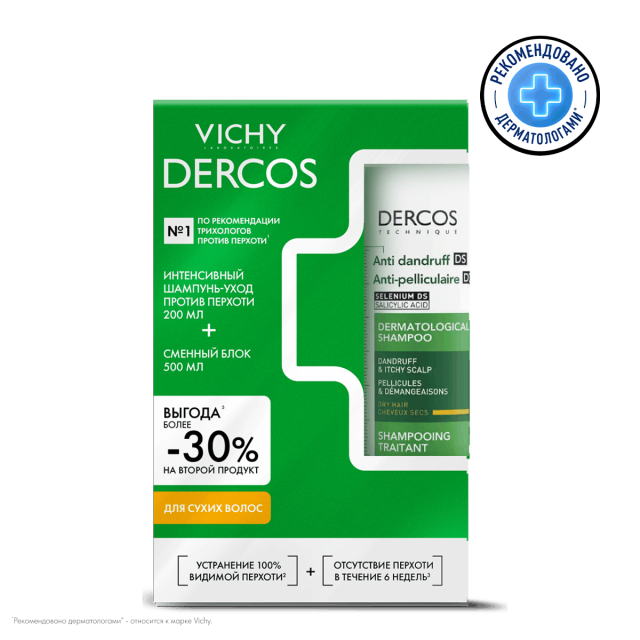 Виши Деркос шампунь против перхоти д/сух.волос 200мл+шампунь 500мл смен.блок