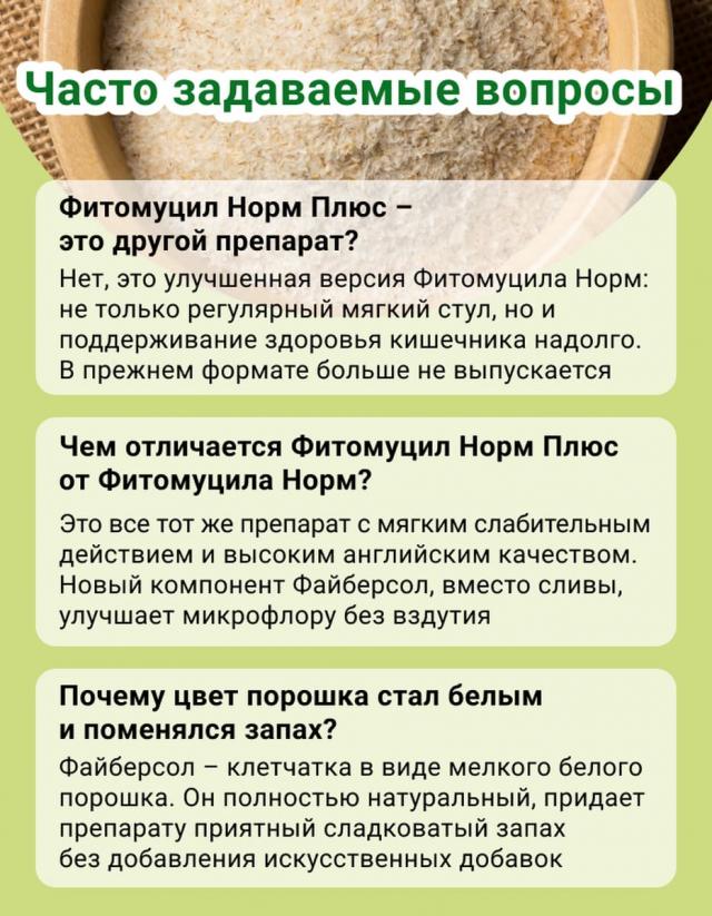 В состав Фитомуцила входят 2 натуральных компонента: оболочка семян особого сорта подорожника Psyllium и мякоть плодов сливы домашней – богатые натуральные источники пищевых волокон (клетчатки). Фитомуцил не содержит сахаров, вкусовых добавок и красителей. Фитомуцил содержит в 4 раза больше растворимых волокон, чем обыкновенные отруби, он «чемпион» по содержанию растворимой клетчатки ** Еще одно преимущество Фитомуцила в том, что в его составе нет сенны, поэтому его очищающий эффект не сопровождается болями и внезапными позывами. Регулярная работа кишечника восстанавливается естественным образом. Отсутствие нежелательных эффектов и привыкания особенно важны в тех случаях, когда принимать слабительное приходится длительно.