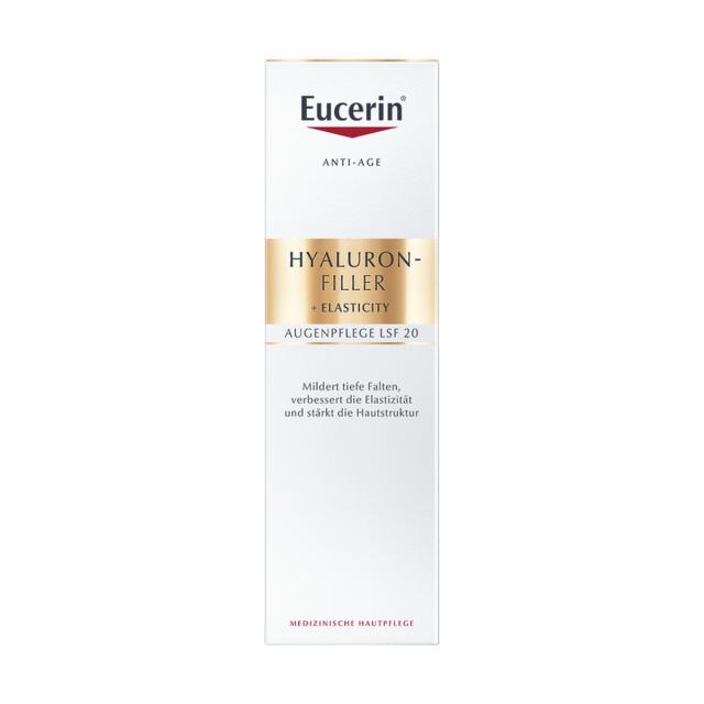 Антивозрастной крем для кожи вокруг глаз Эуцерин SPF 20 Гиалурон-Филлер + Эластисити содержит активные ингредиенты, действующие в 3-х направлениях: