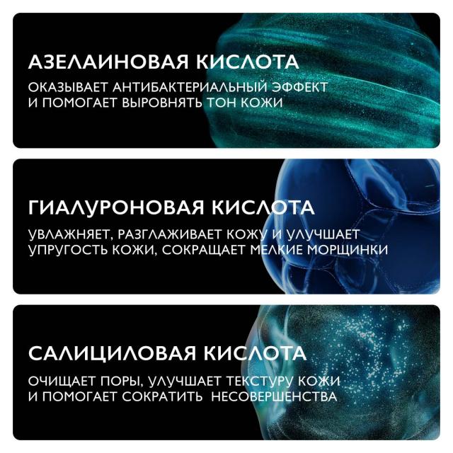 Уникальная* комбинация из трех кислот с комплексным воздействием на несовершенства и текстуру кожи: