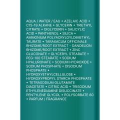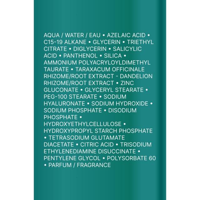 AQUA / WATER / EAU, AZELAIC ACID, C15-19 ALKANE, GLYCERIN, TRIETHYL CITRATE, DIGLYCERIN, SALICYLIC ACID, PANTHENOL, SILICA, AMMONIUM POLYACRYLOYLDIMETHYL TAURATE, TARAXACUM OFFICINALE RHIZOME / ROOT EXTRACT, DANDELION RHIZOME / ROOT EXTRACT, ZINC GLUCONATE, GLYCERYL STEARATE, PEG-100 STEARATE, SODIUM HYALURONATE, SODIUM HYDROXIDE, SODIUM PHOSPHATE, DISODIUM PHOSPHATE, HYDROXYETHYLCELLULOSE, HYDROXYPROPYL STARCH PHOSPHATE, TETRASODIUM GLUTAMATE DIACETATE, CITRIC ACID, TRISODIUM ETHYLENEDIAMINE DISUCCINATE, PENTYLENE GLYCOL, POLYSORBATE 60, PARFUM / FRAGRANCE.