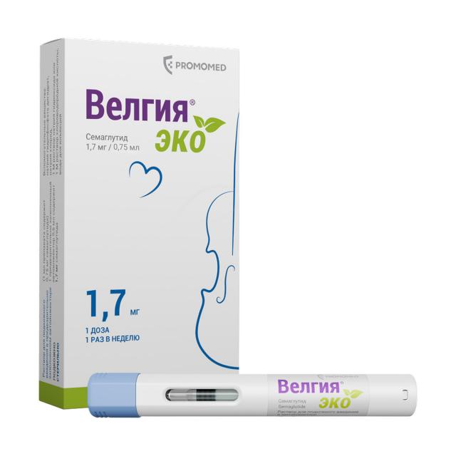 Велгия® эко – это препарат, содержащий действующее вещество семаглутид, который назначается в качестве дополнения к низкокалорийной диете и физической активности для коррекции и контроля массы тела. Семаглутид относится к группе лекарственных средств: средства для лечения сахарного диабета; гипогликемические средства, кроме инсулинов. Семаглутид является аналогом природного гормона – глюкагоноподобного пептида-1 (ГПП-1), который выделяется после приема пищи и служит физиологическим регулятором углеводного обмена (уровня инсулина и глюкозы), а также аппетита и потребления пищи. Семаглутид воздействует на мишени (рецепторы) в головном мозге, которые контролируют аппетит, что помогает Вам быстрее почувствовать себя сытым, сохранить это ощущение надолго и снизить повышенную тягу к приему пищи. Также семаглутид затормаживает эвакуацию пищи из желудка, что дополнительно поддерживает длительное ощущение сытости. Такой механизм поможет Вам привыкнуть к правильному питанию и эффективно снизить массу тела. При приеме семаглутида наблюдаются дополнительные эффекты, такие как уменьшение окружности талии, улучшение обмена веществ (уровня липидов, глюкозы и др.), улучшение параметров сердечно-сосудистой системы (артериальное давление, пульс). Снижение массы тела на фоне приема семаглутида способствует уменьшению риска развития осложнений, связанных с наличием повышенной массы тела, в частности, сердечно-сосудистых заболеваний, сахарного диабета 2 типа (СД2), репродуктивных нарушений, заболеваний суставов, печени и др.