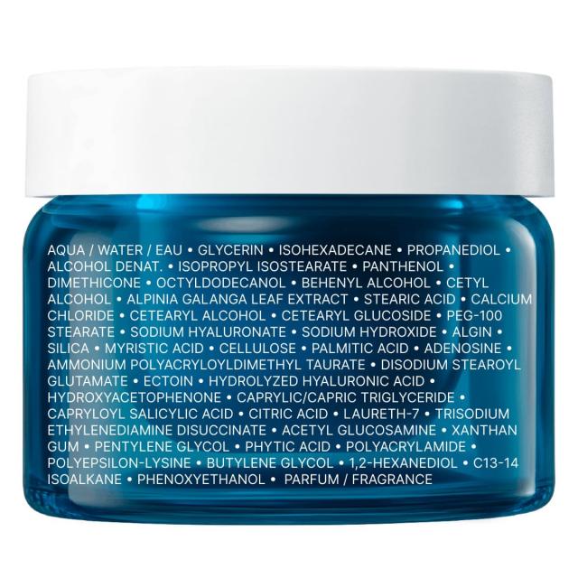 AQUA / WATER / EAU, GLYCERIN, ISOHEXADECANE, PROPANEDIOL, ALCOHOL DENAT., ISOPROPYL ISOSTEARATE, PANTHENOL, DIMETHICONE, OCTYLDODECANOL, BEHENYL ALCOHOL, CETYL ALCOHOL, ALPINIA GALANGA LEAF EXTRACT, STEARIC ACID, CALCIUM CHLORIDE, CETEARYL ALCOHOL, CETEARYL GLUCOSIDE, PEG-100 STEARATE, SODIUM HYALURONATE, SODIUM HYDROXIDE, ALGIN, SILICA, MYRISTIC ACID, CELLULOSE, PALMITIC ACID, ADENOSINE, AMMONIUM POLYACRYLOYLDIMETHYL TAURATE, DISODIUM STEAROYL GLUTAMATE, ECTOIN, HYDROLYZED HYALURONIC ACID, HYDROXYACETOPHENONE, CAPRYLIC/CAPRIC TRIGLYCERIDE, CAPRYLOYL SALICYLIC ACID, CITRIC ACID, LAURETH-7, TRISODIUM ETHYLENEDIAMINE DISUCCINATE, ACETYL GLUCOSAMINE, XANTHAN GUM, PENTYLENE GLYCOL, PHYTIC ACID, POLYACRYLAMIDE, POLYEPSILON-LYSINE, BUTYLENE GLYCOL, 1,2-HEXANEDIOL, C13-14 ISOALKANE, PHENOXYETHANOL, PARFUM / FRAGRANCE.