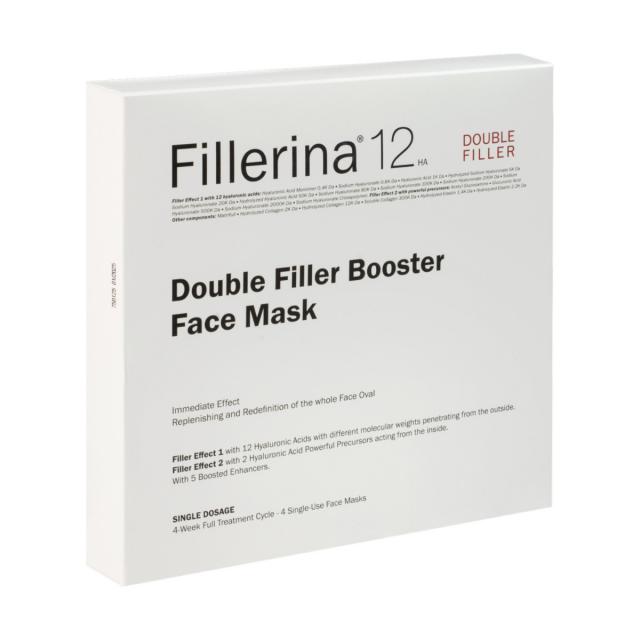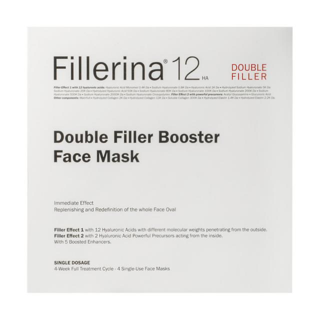Fillerina 12HA Double Filler — интенсивная тканевая маска для лица, созданная по запатентованной технологии Labo Cosprophar. Маска пропитана составом с мощной формулой, содержащей 12 гиалуроновых кислот, 2 прекурсора гиалуроновой кислоты, 3 молекулы коллагена и 2 молекулы эластина различной молекулярной массы. Это сочетание обеспечивает комплексное омолаживающее действие: кожа становится более упругой, восстанавливается её плотность, а овал лица приобретает чёткость и определённость.