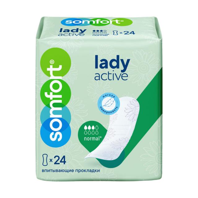 Somfort Lady Active Normal (Сомфорт Леди Актив Нормал) — мягкие впитывающие прокладки, обеспечивающие тройную защиту от протеканий, влаги и запаха.). Ннадежные урологические прокладки, созданные для усиленного впитывания при легкой степени недержания. Благодаря гранулам суперабсорбента в составе впитывающего слоя быстро поглощают влагу, удерживая ее внутри прокладки, и нейтрализуют запах. Мягкие эластичные резиночки по бокам поддерживают форму прокладки и обеспечивают дополнительную защиту от протеканий. Мягкая поверхность дарит ощущение комфорта.