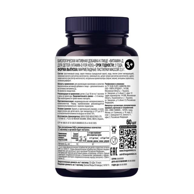 LIVS kids VITAMIN-D FOR KIDS - жизненно важный элемент для нормального роста и развития детского организма. Он необходим для формирования крепких костей, поддержания иммунной системы и регулирования обмена кальция и фосфора. Особенно важен в периоды активного роста и при недостатке солнечного света (осень-зима).