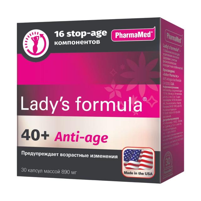 Lady’s formula 40+ Anti-age специальный anti-age комплекс дает возможность продлить молодость, предупредить преждевременное старение и раннюю менопаузу. В его составе 16 компонентов, среди которых экстракты лекарственных растений, фитоэстрогены и необходимые для этого возраста витамины и минералы. Каждый из компонентов усиливает действие друг друга, сохраняя при этом свою направленность действия.
