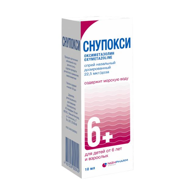Лекарственный препарат СНУПОКСИ содержит действующее вещество оксиметазолин. Оксиметазолин относится к группе местных сосудосуживающих средств (деконгестантов), которые сужают сосуды слизистой оболочки носа. Препарат применяется для облегчения дыхания при заложенности носа. Оксиметазолин в лекарственной форме спрей назальный дозированный, 22,5 мкг/доза, действует с 25 секунды. Продолжительность действия препарата до 12 часов.