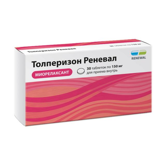 Толперизон Реневал, 150 мг, таблетки, покрытые пленочной оболочкой. Каждая таблетка содержит 150 миллиграмм толперизона (в виде гидрохлорида).