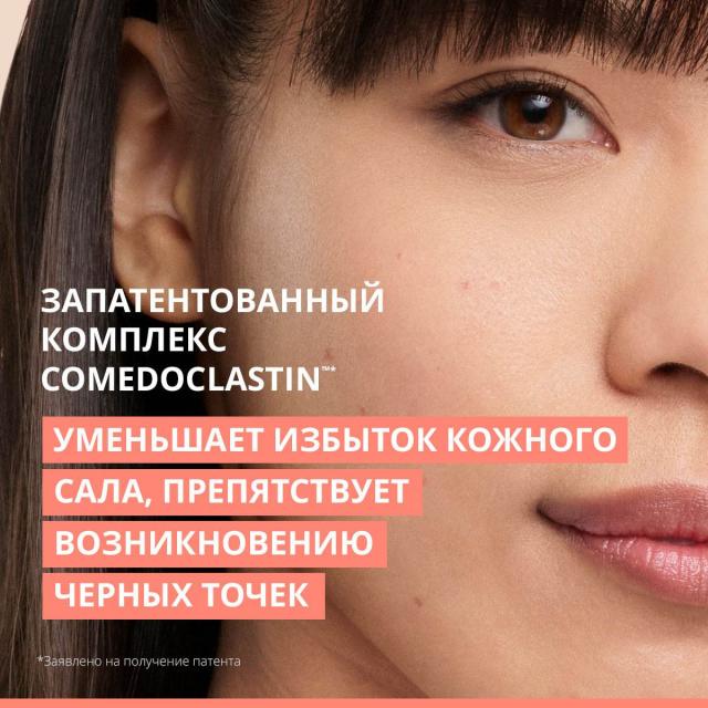 Интенсивно очищает жирную и склонную к акне кожу: комплекс кератолитических кислот очищает поры, запатентованный активный компонент ComedoclastinТМ* уменьшает избыток кожного сала и препятствует возникновению чёрных точек. Гель-пилинг мягко отшелушивает, способствует постепенному уменьшению несовершенств и разглаживает кожу.