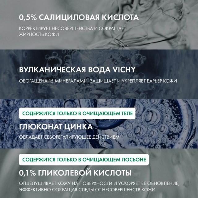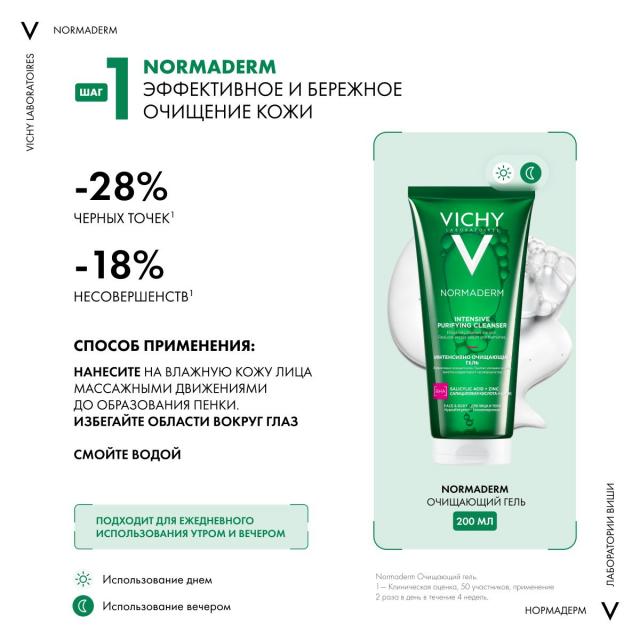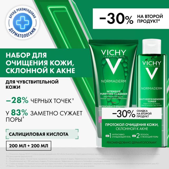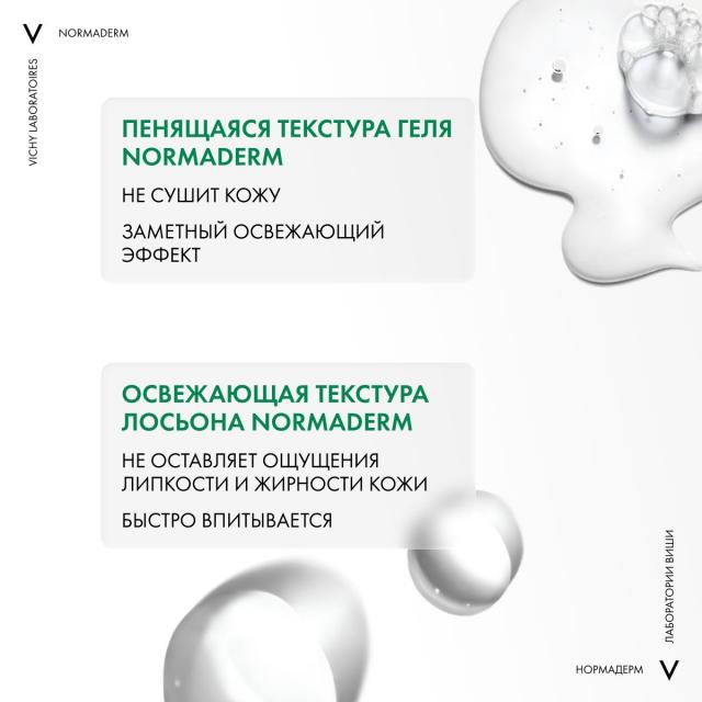 2. Уникальное сочетание активных пилинг-ингредиентов и успокаивающих компонентов в очищающем лосьоне VICHY NORMADERM для глубокого очищения проблемной кожи.