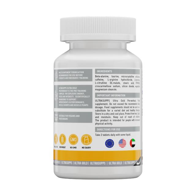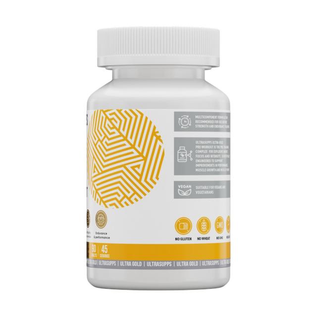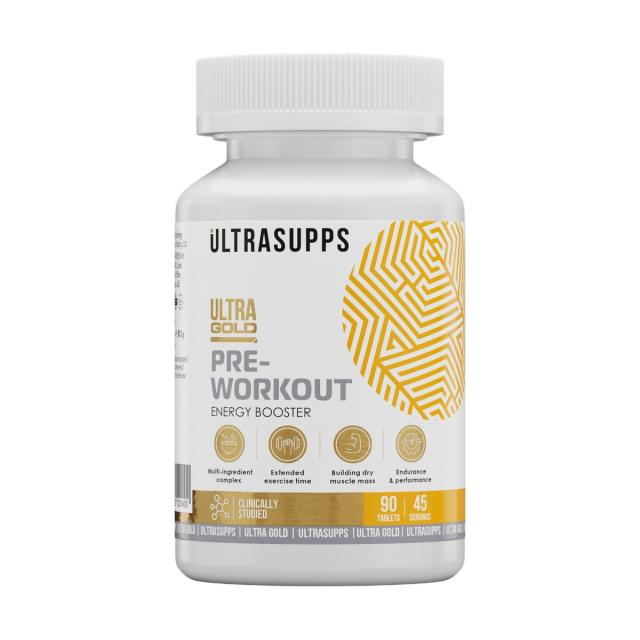 Ultra Gold Pre-workout от бренда ULTRASUPPS — ваш предтренировочный комплекс для подготовки организма к физическим нагрузкам и лучших спортивных результатов. В состав продукта включены важные компоненты, которые подготавливают организм к интенсивным продуктивным тренировкам и обеспечивают его необходимым уровнем энергии:
