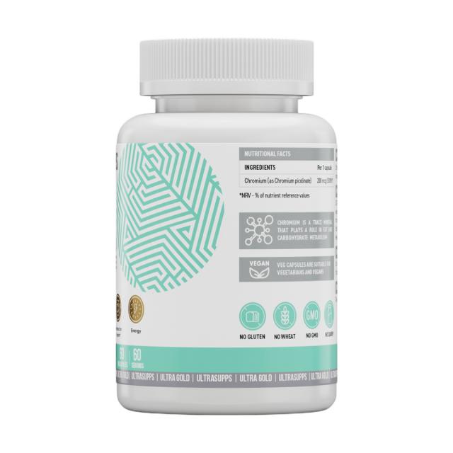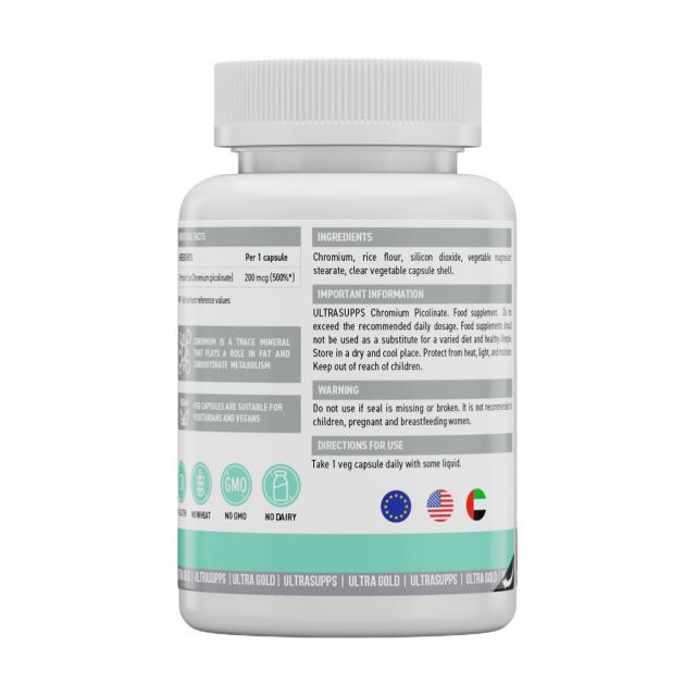 Ultra Gold Chromium Picolinate от бренда ULTRASUPPS — 200 мг пиколината хрома - это ваш надежный источник хрома, который способствует восстановлению мышц и пополнению запасов гликогена. В течение всего дня хром как кофактор инсулина участвует в процессе превращения глюкозы в энергию, он крайне важен для здорового обмена углеводов и контроля уровня сахара в крови. Прием хрома помогает контролировать аппетит и снижает тягу к сладкому, чтобы вы могли еще быстрее приблизиться к своим спортивным целям.