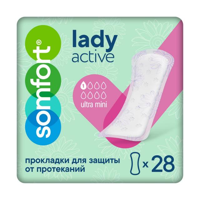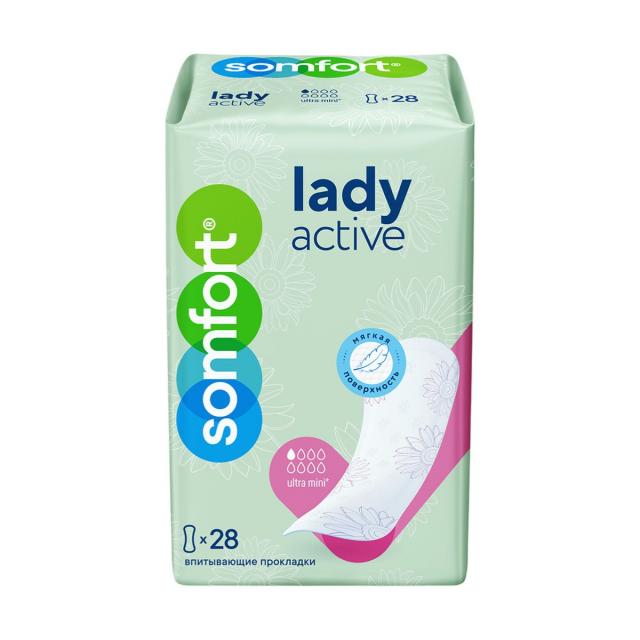 Somfort Lady Active Ultra Mini (Сомфорт Леди Актив Ультра Мини) — это ультратонкие впитывающие прокладки, созданные для надежной защиты при недержании легкой (капельной) степени. Ультрамягкая поверхность приятна на ощупь и нежно соприкасается с кожей. Благодаря гранулам суперабсорбента в составе впитывающего слоя быстро поглощают влагу, удерживая ее внутри прокладки, и нейтрализуют запах.
