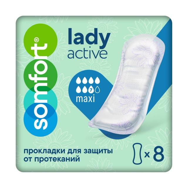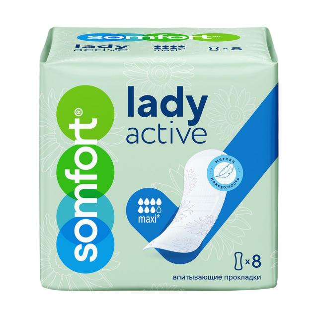 Somfort Lady Active Maxi (Сомфорт Леди Актив Макси) — супервпитывающие прокладки с усиленной впитывающей способностью для защиты при недержании легкой степени. Благодаря гранулам суперабсорбента в составе впитывающего слоя быстро поглощают влагу, удерживая ее внутри прокладки, и нейтрализуют запах. Мягкие эластиченые резиночки по бокам поддерживают форму прокладки и обеспечивают дополнительную защиту от протеканий. Мягкая поверхность дарит ощущение комфорта.