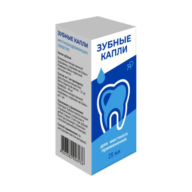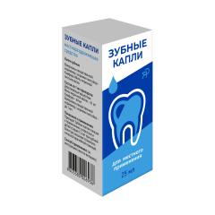 Капли зубные. По 10 мл, 15 мл, 25 мл, 50 мл во флаконах/флаконах-капельницах оранжевого стекла, укупоренных пробками полимерными из полиэтилена высокого или низкого давления и крышками навинчиваемыми из полиэтилена высокого или низкого давления, или смеси полиэтилена высокого и низкого давления, или полипропилена;