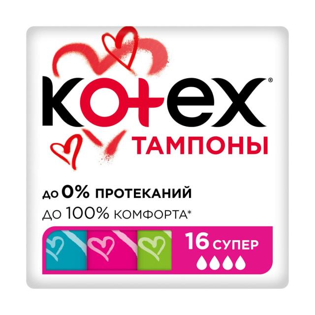 KOTEX ТАМПОНЫ SUPER - гарантируют максимально комфортное введение благодаря поверхности SilkyCover, а гидрофильные волокна Ultrasorb быстро впитывают влагу. Специальная голубая зона, состоящая из гидрофильных волокон «Ultra Sorb быстро проводит влагу, удерживают ее внутри и обеспечивают надежную защиту от протеканий.