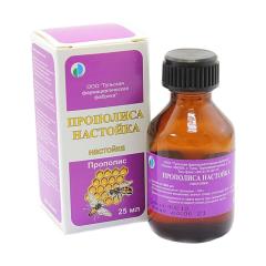 Действующее вещество: спиртовое извлечение из прополиса 1 : 10. Содержит не менее 70% спирта этилового