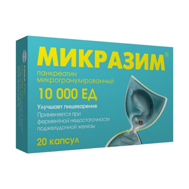 Микразим® - пеллеты панкреатина в капсулах. В состав препарата входят натуральные ферменты из поджелудочной железы животных - протеаза, липаза и амилаза, обеспечивающие переваривание белков, жиров и углеводов пищи.
