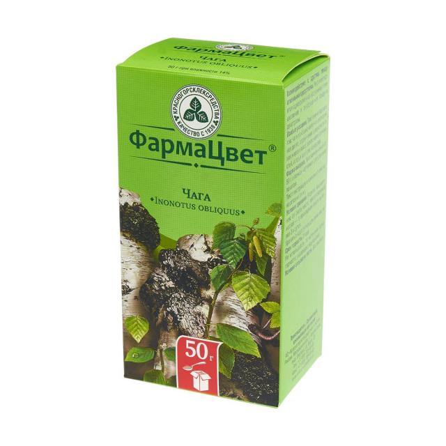 Чага измельченная по 50 г в пачках картонных с внутренним пакетом.
